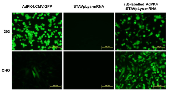 Adenoviral vectors mediate gene delivery that is dictated by the tropism of the parental adenovirus species. To this end, various methods have been employed to expand adenovirus tropism towards the goal of optimized gene delivery [18,19,20,21,22]. Of note in this regard, polylysine can interact with a range of cellular membrane surface molecules [23,24]. When complexed to adenovirus, this polylysine binding could potentially alter the native tropism of the adenovirus infection for effective gene delivery. On this basis, we hypothesized that the polylysine component of the AdpL could potentially expand the range of cellular targets susceptible to adenovirus mediated gene delivery. For this study, we utilized the human embryonic cell line 293, which has ample expression of cell surface receptors for the porcine knob 4 binding domain of AdPK4. As control, we also utilized CHO, which is negative for the adenovirus porcine knob 4 binding domains. We infected each cell line with AdPK4.CMV.GFP, which expresses GFP from the viral DNA as a reporter, polylysine complexed luciferase encoding mRNA (STAVpLys-mRNA), or AdpL-mRNA. As expected, we observed that AdPK4.CMV.GFP effectively delivered the GFP reporter to 293 cells while the negative control CHO cells were resistant, and the polycation complexed mRNA (STAVpLys-mRNA) did not mediate any gene transfer. On the other hand, the AdpL-mRNA that embodied the AdPK4 component achieved highly efficient gene transfer of the GFP reporter in both 293 cells as well as the CHO cells (Figure 3). This observation suggests that, in the context of the AdpL-mRNA design, the polylysine component can contribute to vector tropism.