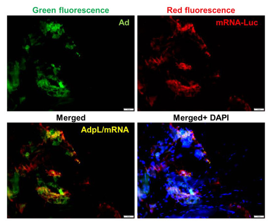 We next sought to determine if the AdpL vector was capable of achieving in vivo delivery of mRNA. We derived AdpL utilized the described GFP expressing AdPK4.CMV.GFP to enable tracking of in vivo gene transfer mediated by the adenovirus. An mRNA encoding a luciferase reporter was complexed to this AdpL vector and administered via the intramuscular route. The AdpL mediated mRNA transfer was evaluated via fluorescence imaging of the muscle (Figure 5). We found colocalized GFP and RFP signals, confirming in vivo gene delivery deriving exclusively from mRNA after AdpL mediated delivery.