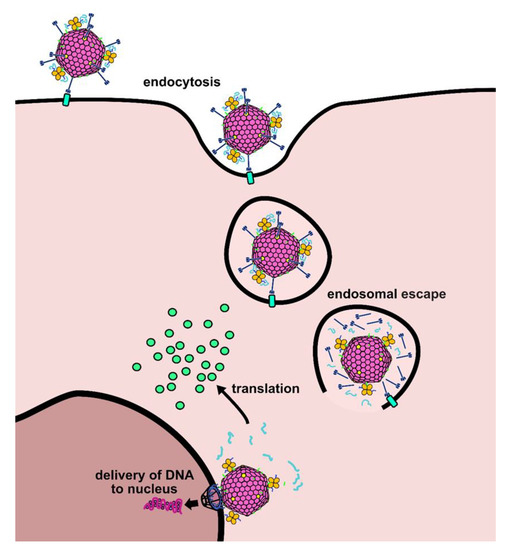 - Wagner, E.; Zatloukal, K.; Cotten, M.; Kirlappos, H.; Mechtler, K.; Curiel, D.T.; Birnstiel, M.L. Coupling of adenovirus to transferrin-polylysine/DNA complexes greatly enhances receptor-mediated gene delivery and expression of transfected genes. Proc. Natl. Acad. Sci. USA 1992, 89, 6099–6103. [Google Scholar] [CrossRef]