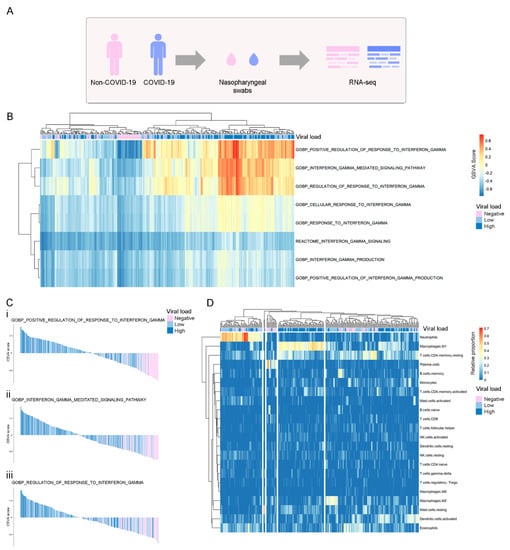 Global assessment at the transcriptional level of pathways and immune cell types related to IFN-γ production, signaling, and regulation of response in COVID-19-positive (light blue and blue) and -negative (pink) patients. (A) Experimental design of the GSE152075 dataset, composed of transcriptome data from nasopharyngeal swabs collected from 430 COVID-19 and 54 non-COVID-19 patients. (B) Non-supervised clustering of patients according to their GSVA score in each IFN-γ geneset. Higher GSVA scores indicate higher activity of the geneset at the RNA level. Each column is labeled according to the COVID-19 viral load of each patient (negative: pink, low: light blue, high: blue). (C) Waterfall plots of selected genesets that were highly activated in COVID-19 patients vs. non-COVID-19 patients. Patients are ordered from the highest to the lowest GSVA score in each geneset. (D) Unsupervised clustering of non-COVID-19 and COVID-19 patients according to the relative proportions of immune cell types estimated by CIBERSORT (LM22 signature) in RNA-seq data. Each column is labeled according to the COVID-19 viral load of each patient. Viral load is represented as a color scale and was categorized as Negative (pink), Low (first quartile; light blue), or High (fourth quartile; blue). COVID-19 patients with intermediate viral load were excluded from the analysis.