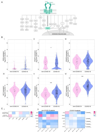 Expression of genes belonging to the canonical IFN-γ pathway in non-COVID-19 and COVID-19 patients. (A) Schematic representation of IFN-γ signaling pathway associated genes. The canonical IFN-γ pathway is represented in green. (B) Gene expression analysis (log2 (norm counts +1)) for (i) IFNG, (ii) IFNGR1, (iii) IFNGR2, (iv) JAK1, (v) JAK2, and (vi) STAT1 in COVID-19 (purple) vs. non-COVID-19 (pink) patients from the GSE152075 dataset, assessed by RNA-seq. p-values correspond to Wilcoxon rank-sum test. Black squares represent the median. (C) Heatmaps depicting the fold change (high = pink; low = blue) for gene expression of genes belonging to the canonical IFN-γ pathway considering sex (i) and age groups 30 s, 40 s, 50 s, 60 s, and 70 s vs. <30 (ii) in non-COVID-19 (left panel) and COVID-19 (right panel) patients from the GSE152075 dataset, assessed by RNA-seq. p-values correspond to decreasing Jonckheere–Terpstra trend test. Statistical significance * p < 0.05; ** p < 0.01; *** p < 0.001.