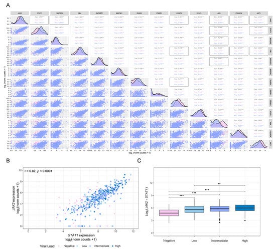 Correlation analysis. (A) Pairwise Spearman correlation matrix analysis between all genes of interest using the GSE152075 dataset. The upper half displays the Spearman coefficients (r) considering all patients (Corr.; black), non-COVID-19 patients (Neg.; pink), or COVID-19 patients (Pos.; purple). Black boxes highlight pairs of genes that have significant correlation only in COVID-19-positive patients, except for JAK2/STAT1, which was the pair with the highest coefficient in COVID-19-positive patients. The lower half displays the scatterplots. (B) Dot plot representing pairwise Spearman correlation for JAK2 and STAT1, considering viral load in COVID-19-positive patients from the GSE152075 dataset. Viral load is represented as a color scale and was categorized as Negative (pink), Low (first quartile; light blue), Intermediate (second and third quartile; purple), or High (fourth quartile; blue), and was considered as an independent variable expressed as cycle threshold (Ct) by RT-qPCR for the N1 viral gene at time of diagnosis. The interpretation for viral load is the lower the Ct, the higher the viral load. (C) Box plot representing the combined expression of JAK2 + STAT1 and their association with the viral load. Viral load was categorized as Negative (pink), Low (first quartile; light blue), Intermediate (second and third quartile; purple), or High (fourth quartile; blue). p-values correspond to Wilcoxon rank-sum test. Statistical significance * p < 0.05; ** p < 0.01; *** p < 0.001.