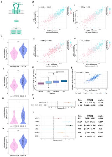 Association between STAT1, JAK1, and ISG’s expressions using the GSE152075 dataset. (A) Schematic representation of the canonical IFN-γ signaling pathway. (B) Gene expression analysis (log2 (norm counts +1)) for MX1 (i), MX2 (ii), ISG15 (iii), and OAS1 (iv) in COVID-19 (purple) vs. non-COVID-19 (pink) patients from the GSE152075 dataset, assessed by RNA-seq. p-values correspond to Wilcoxon rank-sum test. (C) Dot plots representing the pairwise Spearman correlation between STAT1 and JAK1, considering the expressions of MX1 (ii), MX2 (ii), ISG15 (iii), and OAS1 (iv) in COVID-19-positive patients. The independent variable is plotted on the x axis, and the dependent variable is plotted on the y axis. MX1, MX2, ISG15 and OAS1 expressions are represented as a color scale (purple = high; pink = low). (D) Box plot representing the combined expression of MX1 + MX2 + ISG15 + OAS1 and their association with the viral load. Viral load was categorized as Negative (pink), Low (first quartile; light blue), Intermediate (second and third quartile; purple), or High (fourth quartile; blue). p-values correspond to Wilcoxon rank-sum test. (E) Dot plot representing pairwise Spearman correlation between JAK2 + STAT1 and MX1 + MX2 + ISG15 + OAS1 combined expressions, considering viral load in COVID-19-positive patients from the GSE152075 dataset. Viral load is represented as a color scale and was categorized as Negative (pink), Low (first quartile; light blue), Intermediate (second and third quartile; purple), or High (fourth quartile; blue). (F) Forest plots representing the coefficient of the viral load as predictor variable in regression analyses (considering age and gender as covariables). (i) Model considering as response variable: combined expression of JAK2 + STAT1 or MX1 + MX2 + ISG15 + OAS1; and (ii) model considering response variable: individual expressions of JAK2, STAT1, MX1, MX2, ISG15 and OAS1. Coef.: Coefficient. CI: Confidence interval. Statistical significance * p < 0.05; ** p < 0.01; *** p < 0.001.