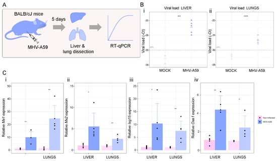 Analysis of ISGs expression in a pre-clinical model of Coronavirus infection. (A) Schematic representation of the experimental design. BALB/cJ female mice (n = 10) were used for the in vivo experiments. Mice were randomly distributed into two experimental groups: non-infected (n = 5) and infected (n = 5) groups. Mice were infected with 6000 PFU of MHV-A59 by intraperitoneal injection of 100 µL of the virus diluted in sterile PBS. Five days after infection, mice were weighed and euthanized by cervical dislocation to dissect the liver and lung for RT-qPCR analyses. (B) Viral load was assessed by RT-qPCR in livers (i) and lungs (ii) of BALB/cJ mice infected (purple) or not (pink) with MHV-A59. Viral load is expressed as-cycle threshold (-Ct) by RT-qPCR for MHV. UVL: undetectable viral load. (C) Mx1 (i), Mx2 (ii), Isg15 (iii), and Oas1 (iv) expressions assessed by RT-qPCR in livers and lungs of BALB/cJ mice infected (purple) or not (pink) with MHV-A59. Values were relativized using Gapdh as a reference gene and normalized to the control. Student’s t-test was performed to determine statistical differences. Statistical significance * p < 0.05; ** p < 0.01; *** p < 0.001; **** p < 0.0001.
