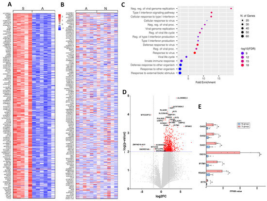 Transcriptomic analysis showing the activation of type I interferon in severe COVID-19. (A) Heat map of the transcriptome of patients with severe COVID-19 (S-group) in comparison with mild/asymptomatic COVID-19 (A-group), (B) comparison between mild/asymptomatic COVID-19 (A-group) and negative (N-group). (C) Bar plot showing the enrichment analysis of genes significantly represented in severe COVID-19 (S-group) as compared to Negative (N-group) samples. (D) Volcano plot depicting the significantly (p-value < 0.01) differentially upregulated and downregulated genes in severe COVID-19 (S-group) as compared to negative (N-group) patients. (E) Bar plot showing the individual interferon stimulated genes upregulated in severe COVID-19 (S-group). * p < 0.01.