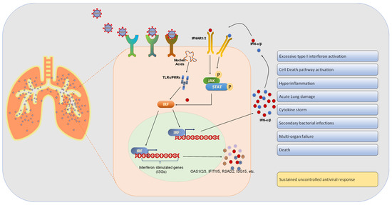 The induced inflammatory response in COVID-19 patients, such as induced interleukin-6 (IL-6), CXCL10, and TNF-α, can lead to hyperactivation of Th1/Th17 responses resulting in recruitment and activation of pro-inflammatory neutrophils and macrophages in lungs [27]. This has been proposed as the prime reason for failure to resolve inflammation in severely symptomatic patients [16,28]. Additionally, SARS-CoV-infected mice exhibited induced pro-inflammatory response and cytokine firing, resulting in pneumonia and lung damage through the recruitment of inflammatory monocyte-macrophages (IMMs). Perhaps, due to the higher levels of IFN-I at the initial phase of infection in potentially severe patients, this mechanism may explain progression to severe disease. Indeed, IFN-I receptor knockout in mice was protective against severe viral lung disease [29,30].
