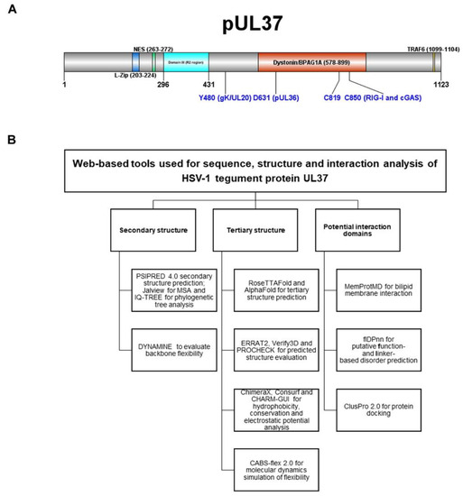 (A) Schematic diagram of HSV-1 UL37 tegument protein functional domains. Amino-and carboxy-termini show previously identified functional domains for viral replication and innate immune regulation. (B) Multiple web-based computational tools and software used for sequence predicted structure and interaction analysis of tegument protein UL37. Webservers and software are grouped according to secondary and tertiary structure and interaction domain analysis.