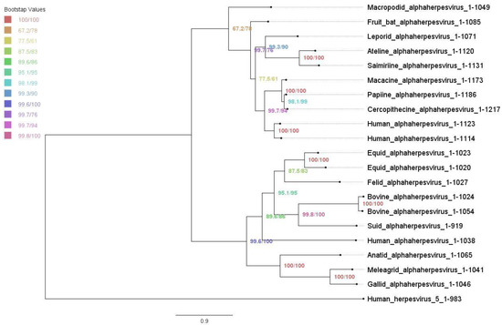 The maximum likelihood tree of UL37 alphaherpesvirus orthologs was constructed using the IQ-TREE Web Server (Figure 2). The overall topology was similar to previously inferred trees based on protein family phylogenetic profiles [52,53]. Bootstrap values showed moderate to good support with a range of 67.2 to 100. Alphaherpesviruses were grouped into two major clades. Simplexviruses were clustered with HSV-1, while members of genus varicellovirus and mardivirus were further grouped into two subclades separating mammalian and avian herpesviruses. The inferred tree was rooted using human herpesvirus-5, which served as an outgroup for reference.