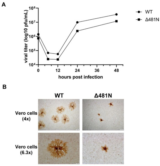 3.4. Viral Replication Kinetics and Plaque Morphology of the Δ481N Virus