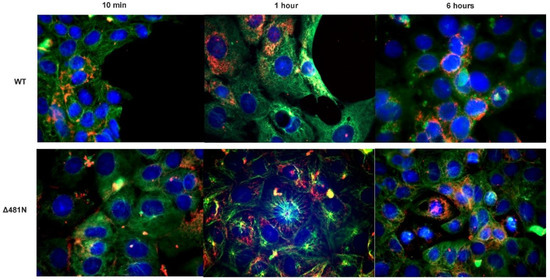 Intracellular transport assay of WT and Δ481N mutant virus. Vero cells were infected with WT and Δ481N mutant virus and examined for transport of viral capsids (red) on the tubulin network (green) at 10 min, 1 h and 6 h after adsorption. Rabbit α-tubulin (Abcam, Inc., Cambridge, MA, USA) (1:100) and mouse anti-HSV-1 ICP5 (Santa Cruz Biotechnology Dallas, TX, USA) (1:100) were used to visualize viral capsid transport. Secondary antibodies used were anti-rabbit Alexa FluorTM 488 anti-mouse Alexa FluorTM 647 (1:1000), respectively. Nuclei (blue) were stained using DAPI (49,6-diamidino-2-phenylindole).