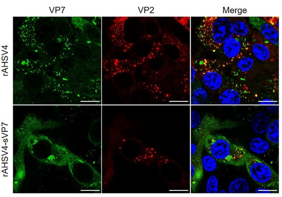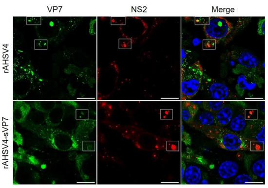 To compare the replication properties of wild-type and mutant rAHSV, next we examined the association of VP7 with VIBs. VIBs are virus factories which act as a scaffold for viral replication and assembly. VP7 foci have previously been shown to associate alongside VIBs [70]. To compare the localisation of VP7 with VIBs for rAHSV4 and rAHSV4-sVP7, the localisation of VP7 with the VIB mediator protein, NS2, was analysed (Figure 3). Results showed that both VP7 and sVP7 associate alongside VIBs in a similar manner (Figure 3 and Figure S3, white boxes) in rAHSV4 and rAHSV4-sVP7 infected cells, respectively.