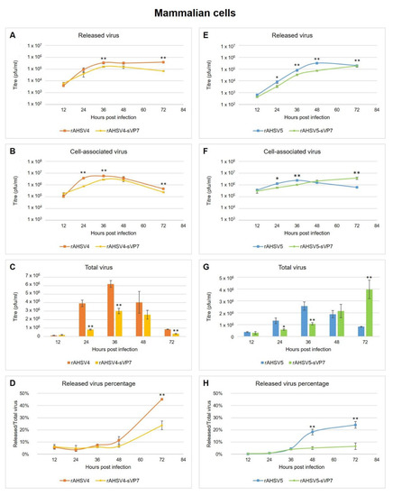 Percentage of released progeny virus, calculated as percentage of released fraction over total virus yield, indicated that rAHSV4 virus release increased rapidly from 36 to 72 hpi (Figure 5D), while rAHSV4-sVP7 has significantly less virus released from 36 hpi onward culminating in almost half released progeny virus overall (Figure 5D). Overall results for rAHSV4 and rAHSV4-sVP7 replication kinetics revealed that rAHSV4-sVP7 produced much less total virus than rAHSV4 with a significant reduction in intracellular virus production at peaks replication times and an overall reduction in released progeny virus. These findings coincide with the finding of reduced virions observed for rAHSV4-sVP7 previously (Figure 2).
