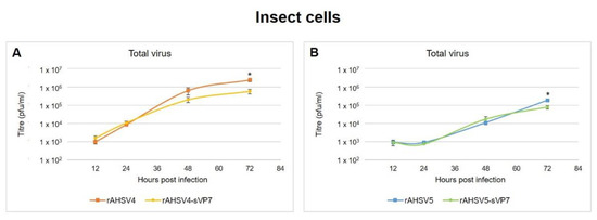 Replication kinetics of rAHSV and rAHSV-sVP7 viruses for attenuated serotype 4 (A) and virulent serotype 5 (B) in insect cells. Total virus yield from infected KC cells (mean titre of virus collected from media and cells) represented on a logarithmic scale. Equal amounts of KC cells were infected at a MOI of 0.1 of each virus, in triplicate, and incubated for 12, 24, 48 and 72 h. Media and cells were collected, lysed and titred as described in Section 2.7. Standard error of the mean is indicated and statistically significant differences to the wild-type virus is indicated as * (p ≤ 0.05).