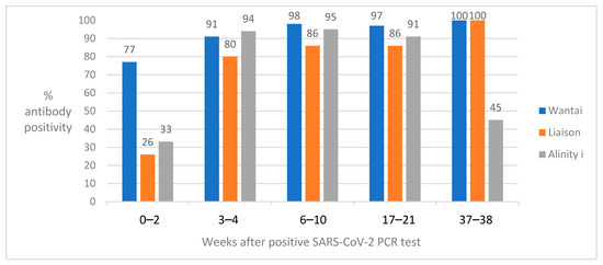 SARS-CoV-2 antibody positivity rates in the Wantai RBD total antibody assay, Liaison S1/S2 IgG assay and Alinity i nucleocapsid IgG assay by analyzing serum samples collected from 46 SARS-CoV-2 infected individuals at two or more time points for up to 38 weeks following PCR positivity. In weeks 37–38, most PCR-positive cases were SARS-CoV-2 vaccinated, resulting in 100% positivity rates in the Wantai RBD total antibody assay and Liaison S1/S2 IgG assay.