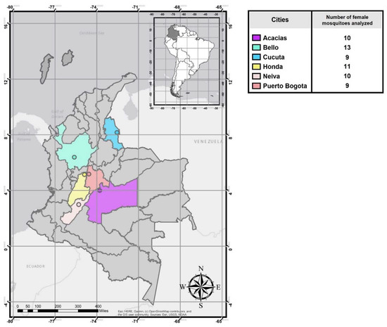 Female mosquitoes were collected between 2016 and early 2017 using sweep nets in six Colombian cities in 10 to 20 randomized houses from four neighborhoods in each city. Staff involved in vector-borne disease programs from each municipality assisted mosquito collection. The location of samples analyzed in this study is shown in Figure 1. These cities were selected because they comprise the majority of arbovirus cases in Colombia [16,19,51,52,53]. Some have had a significant epidemiological history for dengue in the last ten years [52,53]. In addition, we chose rural areas where entomological surveillance is deficient. The distance between the closest cities (Honda and Puerto Bogotá) is approximately 7 km. In Colombia, it has been shown that even in geographically close populations there may be differences for Ae. aegypti in vector competence for DENV [54,55] and in hatching, development time, longevity, and fecundity [56]. This suggests that some specific parameters at the local level, such as bacterial diversity or resistance to insecticides, may be differential and relevant to elucidate the different degrees of transmission of arboviruses.