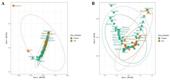 Bacterial diversity and richness were assessed using the Shannon and Simpson indices, which determine alpha diversity. Although the median of the ZIKV-infected group was lower than that of the uninfected group, there were no significant differences (p > 0.05) in species diversity in each community for both indices (Supplementary Figure S1A,B).