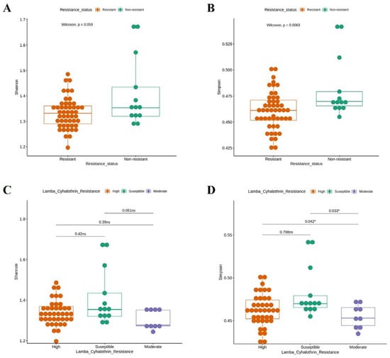 Comparison of bacterial diversity in the midgut of Ae. aegypti among resistant and non-resistant (A,B) and highly lambda–cyhalothrin-resistant, susceptible, and moderately resistant populations (C,D). Shannon (A,C) and Simpson (B,D) alpha diversity indices are shown. Wilcoxon rank-sum tests were conducted under R statistical software version 4.1.2. Groups were significantly different when p < 0.05.
