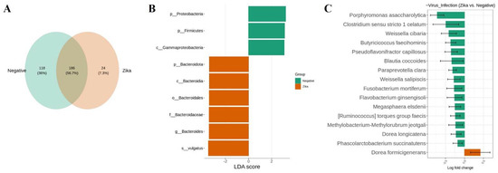 Bacterial community composition of Colombian Ae. Aegypti midguts are naturally infected with ZIKV. (A) Venn diagram of bacteria showing the common and unique OTUs between ZIKV-infected and non-infected females. (B) An abundance of bacterial taxa among groups using LefSe analysis. LDA scores of biomarker bacteria are shown as horizontal bars for biomarker bacteria with an LDA score (log10) > three and with an alpha value of 0.05. (C) Differential abundance analysis stratified by ZIKV infection using ANCOM-BC (significant at 5%).