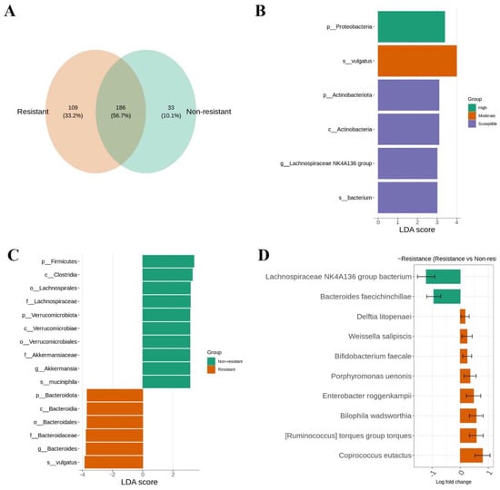 Bacterial community composition of Colombian Ae. aegypti midguts associated with lambda–cyhalothrin susceptibility, and moderate and high resistance. (A) Venn diagram of bacteria showing the common and unique OTUs in insecticide-resistant and non-resistant females. (B,C) An abundance of bacterial taxa among groups using LEfSe analysis. LDA scores of biomarker bacteria are shown as horizontal bars for biomarker bacteria with an LDA score (log10) > three and with an alpha value of 0.05. (D) Differential abundance analysis stratified by resistance using ANCOM-BC (significant at 5%).