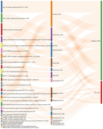 Enriched KEGG genes according to bacteria associated with midgut naturally infected with ZIKV in Colombian Ae. aegypti. This Sankey visualizes KEGG pathway groups’ significance (p < 0.05) with ANCOM-BC analysis. The numerical value shows PICRUSt2 gene counts corresponding with taxonomy at the genus level. This chart shows the top 20 KEGGs per category by count. For an interactive view, visit https://observablehq.com/d/cd9c60c5c86289ce (accessed on 20 August 2022).