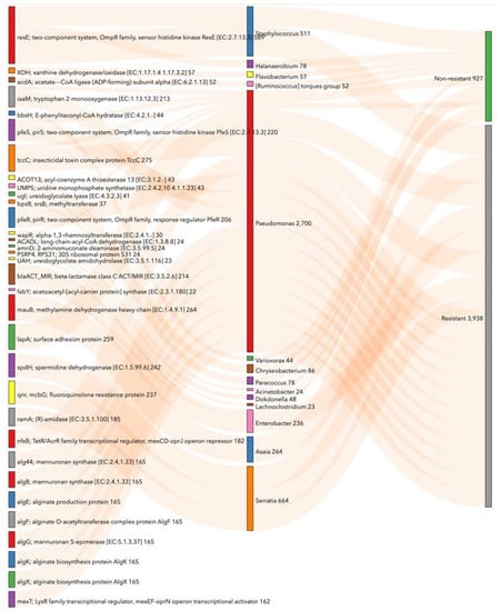 In parallel, Pseudomonas was a genus with more KEGG function associations with lambda–cyhalothrin-resistant females. This genera was related with tryptophan 2-monooxygenase (iaaM); two-component system, OmpR family, sensor histidine kinase PfeS (pfeS, pirS); tccC; two-component system, OmpR family, response regulator PfeR (pfeR, pirR); alpha-1,3-rhamnosyltransferase (wapR); surface adhesion protein (lapA); nfxB; mannuronan synthase (alg44, alg8); alginate production protein (algE); alginate O-acetyltransferase complex protein AlgF (algF); mannuronan 5-epimerase (algG); alginate biosynthesis protein AlgK (algK); alginate biosynthesis protein AlgX (algX); LysR family transcriptional regulator; mexEF-oprN operon transcriptional activator (mexT). Moreover, Serratia was related to spermidine dehydrogenase (spdH), fluoroquinolone resistance protein (qnr), and (R)-amidase (ramA) (Figure 8).