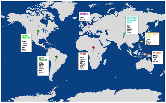 Global distribution of flaviviruses. Multiple flaviviruses co-circulate in most continents; of these, at least one virus belongs to the JE serocomplex. Co-circulation of more than one JE serocomplex virus occurs in Africa, Europe, Asia and Australia. The figure was generated using an online tool, URL: https://mapchart.net. (DENV: Dengue virus; IHLV: Ilheus virus; JEV: Japanese encephalitis virus; MVEV: Murray valley encephalitis virus; POWV: Powassan virus; ROCV: Rocio virus; SPOV: Spondwenii virus; USUV: Usutu virus; WSLV: Wesselsbron virus; WNV: West nile virus; YFV: Yellow fever virus; ZIKV: Zika virus).