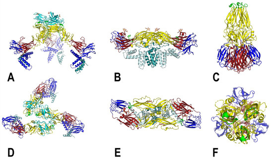 Models of the flavivirus structural proteins corresponding to various stages in the virus life cycle. (A–C): Immature DENV1 trimer, mature USUV dimer and the fusogenic DENV hairpin conformation, respectively. Corresponding top views are depicted in (D–F), respectively. For the immature E trimer and the E dimer, the E-stem region is also shown. The models are color coded as follows: DI (red), DII (yellow), DIII (blue), fusion loop (green), glycosylation sites (orange) and prM (cyan); for (B,E), the E-stem is in light blue and M protein is in teal.