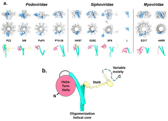 Structures of phage TerSs deposited in the PDB and EMDB. (a) Quaternary structures of TerS proteins from Podoviridae, Siphoviridae, and Myoviridae are shown as side and top views. All structures are shown in scale, with the protomer “A” colored in blue and the rest of the oligomer in gray. The tertiary structures of each TerS protomer are shown under the oligomer color-coded to highlight the N-terminal HTH-domain (magenta), the oligomerization core (cyan), and the stalk (yellow). All TerS oligomers and protomers are in scale. (b) A schematic diagram of the TerS-fold that consists of three conserved structural regions and a variable C-terminal moiety (dashed line).