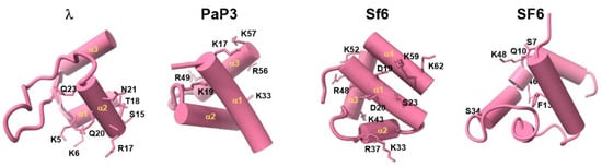 TerS N-terminal helix–turn–helix motif involved in DNA binding. Structures of experimentally determined HTH motifs from phages λ, PaP3, Sf6, and SF6. Residues involved in DNA binding and identified through site-directed mutagenesis are shown as sticks.