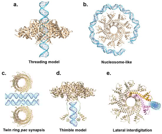 Alternative models have been proposed to reconcile the biochemical data and explain nucleobase-specific recognition. Black et al. proposed an extension of the nucleosome model, referred to as the ‘twin ring pac synapsis’ [102] (Figure 4c). According to this model, T4 TerS functions as two stacked rings that recognize two apposed pac sites to gauge concatemer maturation adequate for packaging initiation. This model, supported by several lines of evidence, may be limited to T4, as twin packs of TerS have not been observed in other phages.