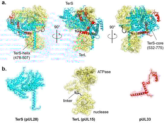 Cryo-EM reconstruction of the tripartite HSV-1 terminase complex (PDB id 6M5S). (a) Ribbon diagram of the three terminase subunits: TerS (pUL28), TerL (pUL15), and pUL33, colored in cyan, yellow, and red, respectively. (b) Tertiary structures of individual terminase subunits are color-coded as in panel (a).