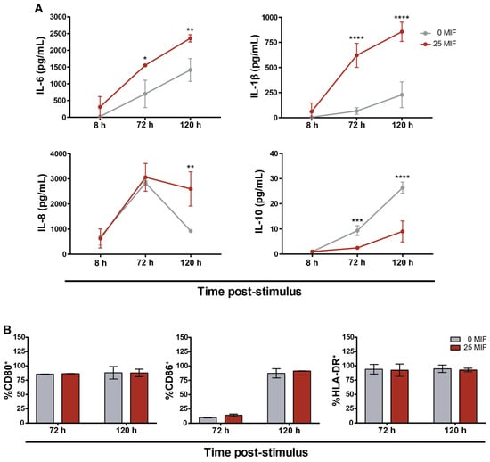 We have previously shown that MIF treatment on HIV-infected MDMs triggers the production of several proinflammatory cytokines in the short term (8 h) [16]. This is in line with MIF treatment producing the same effect on a wide variety of cells [13,39]. The evaluation of the cytokines released to extracellular media and membrane marker expression on MDM surface is indicative of its profile [40]. Thus, we started by evaluating MDM phenotype and production of proinflammatory markers after longer periods (8, 72 and 120 h) following MIF stimulus (25 ng/mL). Higher levels of IL-6, IL-1β and IL-8 and lower levels of IL-10 were detected in MIF stimulated condition, compared to untreated controls (Figure 1A). TNFα expression was not altered by MIF treatment and neither IL-4 nor IFNγ were detected in these supernatants. No differences in the surface expression of CD80, CD86 and HLA-DR were observed between MIF-treated and control conditions after 72 or 120 h post-stimulus (Figure 1B), and no differences were either observed when analyzing their MFI. Thus, the concentration of pro-inflammatory cytokines IL-6, IL-1β and IL-8 remained elevated 120 h post-MIF stimulus, while no difference was observed in the expression of MDM activation markers.