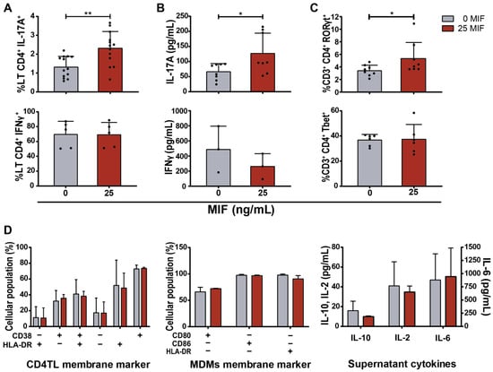 CD4TL differentiation profile after five days of co-culture with HIV-infected MDMs treated with MIF. (A) Proportions of IL-17A-producing CD4TL (upper panel) and IFN-γ-producing CD4TL (lower panel); (B) Concentration of soluble IL-17A (upper panel) and IFN-γ (lower panel); (C) Proportions of RORγT-expressing CD4TLs (upper panel) and T-bet-expressing CD4TLs (lower panel) in MIF-treated and untreated co-cultures. (D) Expression of activation markers CD38 and HLA-DR on CD4TLs, CD80, CD86 and HLA-DR on MDMs and concentrations of IL-2, IL-6 and IL-10 in culture supernatants. Dark red bars: MIF-treated cultures. Grey bars: untreated cultures. Each point represents an independent experiment comprising triplicates. Bars indicate mean ± SD of all independent experiments. Data analysis was performed by Student’s t-test. * p < 0.05, ** p < 0.01.