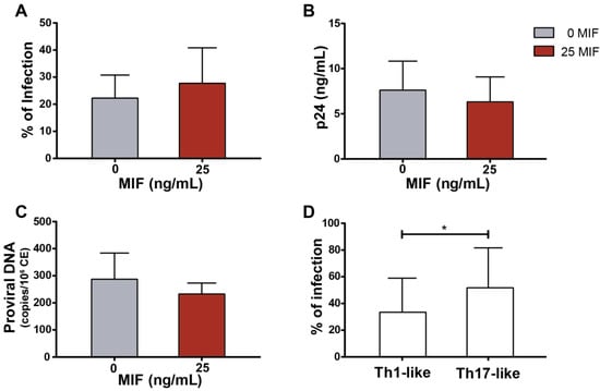 Since MDMs are infected and co-cultured with non-infected but permissive CD4TLs, CD4TL infection mediated by cell-to-cell transmission is a factor to be accounted. To evaluate the efficiency of this process in the presence of MIF, infection percentages were evaluated in CD4TLs after five days of co-culture by p24 antigen intracellular staining and flow cytometry analysis (Figure 3A), by evaluating the concentration of p24 antigen in culture supernatants (Figure 3B), and by quantitation of proviral DNA by real-time PCR (Figure 3C). No differences were found between the MIF-treated cultures and the untreated cultures, suggesting that MIF stimulation had no effect on cell-to-cell trans-infection process. As it is broadly described in bibliography, Th17 profile shows a higher susceptibility and permissiveness to HIV-1 infection compared to other CD4TL profiles. However, differences in the proportions of Th17-like cells shown in Figure 2 did not translate into a measurable difference in the efficacy of total cell-to-cell viral infection. However, as it is shown in Figure 3D, Th17-like cells in the cell culture presented an overall higher infection percentage compared to our co-culture model. Additionally, no differences in the infection percentage of Th17-like cells were observed when comparing the MIF stimulated condition to the untreated control. Thus, the results obtained to date might indicate that MIF would promote an increase in the number of Th17-like cells in this co-culture model, without increasing their susceptibility to HIV infection.