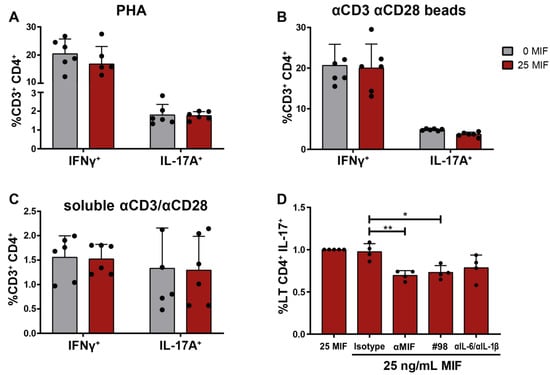 Study of the mechanism involved in Th17-like profile promotion. IL-17A and IFNγ-expressing CD4TLs after conditioning with HIV-infected MIF-stimulated MDM-derived supernatant in parallel with (A) PHA stimulation, (B) CD3/CD28-engaging beads stimulation and (C) CD3/CD28-engaging antibodies stimulation. (D) Proportion of IL-17A-producing CD4TLs after MIF blocking in the context of an MIF-treated cell co-culture. From left to right: cell co-culture control with 25 ng/mL of MIF, immunoglobulin isotype control, MIF-neutralizing monoclonal antibody, MIF chemical antagonist (#98), IL-6 and IL-1β neutralizing monoclonal antibodies. Each point represents an independent experiment comprising triplicates. Bars indicate the mean ± SD of all independent experiments each one performed in triplicate. Data analysis was performed by a one-way ANOVA and Tukey’s post-test (excluding the positive control). * p < 0.05, ** p < 0.01.