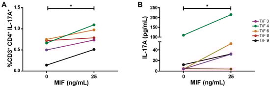 Transmitted/founder (T/F) HIV-strain MDM infection of co-culture resembles Th17-like profiling. (A) Proportion of IL-17A-expressing CD4TLs on MIF-treated co-cultures with T/F HIV-strain-infected MDMs. (B) Soluble IL-17A concentration in culture supernatants on MIF-treated co-cultures with T/F HIV-strain-infected MDMs. Data show the mean of two independents experiments with five different T/F HIV strains each one performed in triplicate. Data analysis was performed with a Student’s t-test (* p < 0.05).
