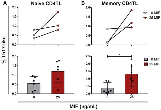 Nevertheless, it has to be taken into account that in, this experimental model, the antigen-presenting cell is an infected MDM, which is a limitation of this work. In a physiological context, the naïve CD4TLs are mainly activated by dendritic cells and not by MDMs, which, in turn, are present in primary lymphatic organs and present an adequate expression of co-stimulatory signals. T-cell profiling is, at present, considered a more flexible process. It is assumed that some cellular re-polarization exists in accordance with the predominant inflammatory micro-environment [57]. Particularly, the exchange proposed in this paper takes place between Treg and Th17 profiles. Both share TGFβ as an inductive stimulus but differ in which cytokine accompanies it: IL-10 for the Treg profile and IL-6 for the Th17 profile [57]. Interestingly, IL-6 also propitiates re-polarization processes in an unidirectional way (from Treg to Th17) [58]. Additionally, what is more important, this was one of the cytokines detected in infected-MDM supernatants in response to MIF stimulus. Thus, MIF (and, potentially, the MIF–CD74 interaction) could be a relevant factor in the CD4TL plasticity that T-cell profiles show in peripheral organs, where the effectors cells (infected MDMs) can be found. The fact that, in our model, both naïve (overall defined as CD45RA+CCR7 high) and memory CD4TLs showed increased proportions of Th17-like cells after MIF stimulus, but only in the memory CD4TL the difference was statistically significant (Figure 6), acquires particular relevance.