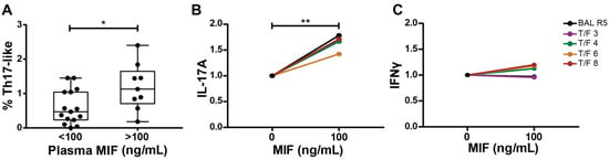 Association between MIF concentration in plasma and the proportion of IL-17A-expressing CD4TL in PBMCs, both derived from PWH. (A) Ex vivo IL-17A-expressing CD4TL percentage in PBMC from PWH segregated by low (<100 ng/mL) or high (>100 ng/mL) MIF plasma concentration. Data represent the median ± IQR25-75 of 15 donors. Data analysis was performed with a Mann–Whitney test. * p < 0.05. (B) Concentration of soluble IL-17A in MIF-stimulated co-cultures after five days of treatment with 100 ng/mL of MIF. MDM infection was performed with T/F HIV strains. Data show the average of means of at least three independent experiments with four different T/F HIV strains and the BAL R5 strain as a control, each one performed in triplicate, relative to the untreated control. Data analysis was performed with a Mann–Whitney test ** p < 0.01. (C) Concentration of soluble IFNγ in MIF-treated co-cultures after five days of treatment with 100 ng/mL of MIF with T/F HIV-strain-infected MDMs. Data show the average of means of at least three independent experiments with four different T/F HIV strains and the BAL R5 strain as a control, each one performed in triplicate, relative to the untreated control. Data analysis was performed with a Student’s t-test.
