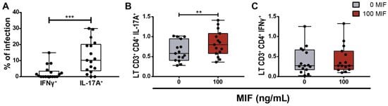 Evaluation of PBMCs from PWH response to MIF stimulus in an ex vivo model. (A) Ex vivo HIV-infection percentage in IL-17A- and IFNγ-expressing CD4TLs derived from PBMCs of PWH. (B) IFNγ intracellular expression on CD4TLs after 24 h of treatment with 100 ng/mL of MIF. (C) IL-17A intracellular expression on CD4TLs after 24 h of treatment with 100 ng/mL of MIF. Both experiments were performed on PBMCs and the results were standardized to the positive control (PBMCs treated with αCD3/αCD28-binding antibodies). Data represent the median ± IQR25-75 of 15 independent donors, each one with one replicate. Data analysis was performed with a Student’s t-test. ** p < 0.01, *** p < 0.001.