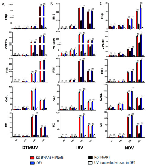 Suppression of ISG induction in IFNAR1-knockout cells infected with DTMUV, IBV and NDV, respectively. The mRNA levels of IFN-β, VIPERN, IFIT5, OASL and MX in cells infected with DTMUV (A), IBV (B) and NDV (C) were detected by RT-qPCR. T tests were conducted between the FINAR1 overexpressed cells (red) and mock cells in KO-IFNAR1 (black), and were conducted between the wild type DF-1 cells (blue) and UV-inactivated viruses treated DF-1 cells (white). * p < 0.05; ** p < 0.01; *** p < 0.001; ns, non-significant.