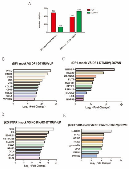 Transcriptomic analysis of differential gene expression in DF-1 and KO-IFNAR1 cells infected with DTMUV. (A) The number of up-regulated genes in DTMUV-infected cells at 24 hpi are shown in red, and the down-regulated genes in green. (B) Top 10 genes with the highest expression levels among all up-regulated genes in the DF-1 infection group transcriptome data. (C) The 10 genes with lowest expression levels among all down-regulated genes in DF-1 infection group transcriptome data. (D) Top 10 genes with the highest expression level among all up-regulated genes in the KO-IFNAR1 infection group transcriptome data. (E) The 10 genes with lowest expression levels among all down-regulated genes in KO-IFNAR1-infected transcriptome data.
