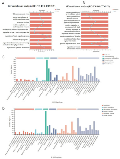 GO enrichment analysis and KEGG analysis of differentially expressed genes in DTMUV—infected DF-1 and KO-IFNAR1 cells. Genes in DF-1 (A) and KO-IFNAR1 (B) cells induced by DTMUV infection were classified using the GO system. Genes induced by DTMUV infection in DF-1 (C) and KO-IFNAR1 (D) cells were classified using the KEGG system.