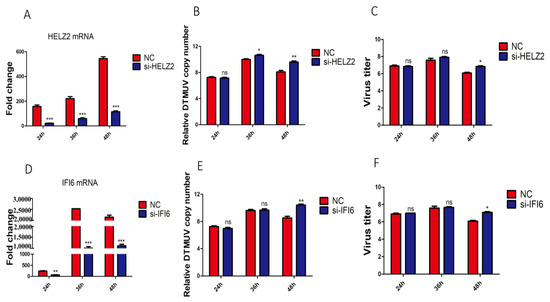 Since HELZ2 and IFI6 were significantly up-regulated by DTMUV infection of both DF-1 and KO-IFNAR1 cells, the antiviral functions of these two genes were studied by transient knockdown in KO-IFNAR1 cells with siRNA, and the effects of HELZ2- and IFI6-knockdown on DTMUV replication were analyzed by RT-qPCR. Efficient knockdown of HELZ2 in KO-IFNAR1 cells resulted in a 4- to 60-fold increase in viral RNA levels and viral titers at 36 and 48 hpi, respectively (Figure 7A–C), and efficient knockdown led to a 100-fold increase in viral RNA levels and viral titers at 48 hpi (Figure 7C–F). These results demonstrate that HELZ2 and IFI6 may be involved in regulating the replication of DTMUV at late infection stages in cells when IFN-I functions are compromised.