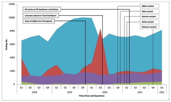 With the emergence of SARS-CoV-2 and arrival in the UK in early 2020, the demand for SARS-CoV-2 testing dramatically increased from 2670 in the first quarter to 83,588 by the fourth quarter of 2020. During the peak of the pandemic in 2020 and 2021 the level of testing remained fairly constant (2020: 44,376 RV, 411 DV, 8719 HV, and 68,156 BBV; 2021: 33,962 RV, 285 DV, 8796 HV, and 78,212 BBV), with the start of 2022 remaining constant (2022 Q1: 2140 RV, 413 DV, 1919 HV, and 8188 BV).