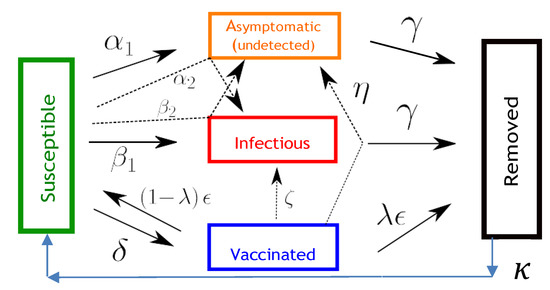 In studying past epidemics, scientists have systematically applied “random mixing” compartmental models which assume that an infectious individual may spread the disease to any susceptible member of the population before being recovered or removed, as originally considered by Kermack and McKendrick [1]. These models comprise population compartments by considering stages of the infection and flows among the various compartments. The choice of the compartments is related to the disease that is being studied. For example, in the standard SIR model, susceptible individuals (S) can become infected/infectious (I) before being permanently recovered/removed (R). In the SIS model, susceptible individuals can become infected/infectious, but when they are recovered/removed, they can become susceptible again; that is, no permanent immunity is acquired. In the SEIR model, the additional compartment is the group of exposed (E) individuals who have become infected but are not yet infectious themselves. Recent models include a vaccinated (V) compartment [2,3] or compartments corresponding to many stages of infection, for instance, susceptible (S), infected (I), diagnosed (D), ailing (A), recognized (R), threatened (T), healed (H) and extinct (E), which is a model referred to as SIDARTHE [4]. Beyond compartmental models, epidemic modeling approaches involve agent-based simulations [5], heterogeneous social networks [6,7], Bayesian inference models [8], and deep learning methods [9], to name but just a few.