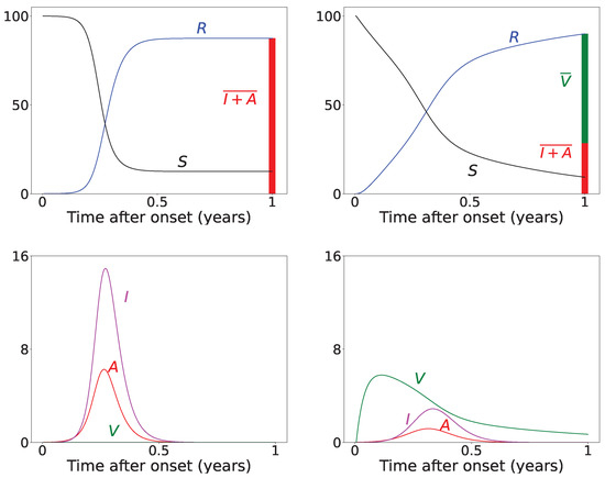 Figure 2. Time evolution of an outbreak obtained by numerically solving the SAIVR model, assuming persistent immunity ( κ = 0 ), acquired either by vaccination or infection recovery. The y-axis represents percentages (of the entire population, n). The x-axis represents time after the onset of the epidemic, the entire duration (T) of which is 1 year. Top row: Results without vaccine rollout (left panel) and with vaccine rollout (right panel) for the recovered population (blue curve) and the susceptible population (black curve). The red bar depicts the total number of infected individuals, I + A ¯ , calculated by Equation (3); the green bar depicts the total number of effectively vaccinated individuals, V ¯ , calculated by Equation (4). Bottom row: Symptomatic infected (I, magenta curve), asymptomatic infected (A, red curve), and vaccinated (V, green curve) populations, without vaccine rollout (left panel) and with vaccine rollout commencing one day after the onset of the epidemic. For both cases, β 1 = 0.16 , α 1 = 0.20 , γ = 1 / 12 , β 2 = 0.001 , α 2 = 0.01 , I 0 = 10 4 N , and A 0 = 0.2 I 0 . For the vaccination case, ζ = 0.001 , η = 0.0005 , λ = 0.95 , ε = 1 / 14 , and δ = 0.005 .