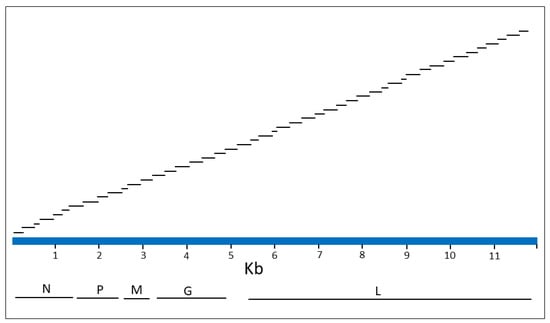 Genomic sequences of test samples were reconstructed from Ampliseq for Illumina reads using reference-guided assembly. For each sample, an initial analysis involved use of the RABV consensus sequence employed for panel design (Figure S1) as the reference for a reference guided assembly (assembly A1). Briefly, sequencing reads weremapped to the reference using minimap2 (version 2.23) [30] with default parameters and SAMtools, version 1.9, (available at http://www.htslib.org) was used to convert the M files to the sorted BAM files. UGENE, version 40.1, (available at https://bio.tools/ugene) was then used to inspect the mapping files and generate the assembly. The final assembled genome was recovered in FASTA format in a single contiguous sequence including gaps for those base positions with zero coverage relative to the reference sequence. An alignment of all sample assemblies with the consensus sequence was generated in MEGA, version X, software (available at https://www.megasoftware.net/older_versions, accessed on 23 August 2019) (Supplementary File S2).