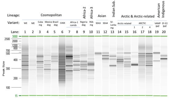 Amplicon profiles of sample aliquots from the cleaned Ampliseq for Illumina library as analyzed by a QIAxcel system. A 15–3000 bp reference marker was included in each run. Lanes 1–20 represent the unfixed samples as follows: 1, V285; 2, V661; 3, V1061; 4. V682; 5, V904; 6, V648; 7, V671; 8, V1453; 9, V463; 10, V050; 11, V1145; 12, V1375; 13, V114; 14, V704; 15, V737; 16, 01RABN00053; 17, V809; 18, V804; 19, V982; and 20, 72RABL03675. Variants were identified as indicated in Table S1. Abbreviations: mg, mongoose; Indian Sub., Indian Subcontinent; RSA, Republic of South Africa.