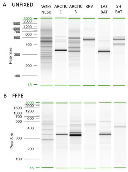 A comparison of amplicon profiles generated by the Ampliseq for Illumina protocol for fixed and FFPE samples of the same RABV variant. The cleaned sequencing library was analyzed by a QIAxcel system with the inclusion of a 15–3000 bp reference marker in each run. Results for unfixed samples (A) and FFPE samples (B) are shown for the following RABV variants: Western skunk/North Central skunk (WSK/NCSK) 04RABL00965, 92RABL01670; Arctic1 01RABN00053, 07RABN06558; Arctic3 91RABN05406, 17RABN00630; Mid-Atlantic raccoon (RRV) ME.2014.0197, 18RABN01852; Lasiurus bat (LAS BAT) V231, 94RABN04952; and Silver-haired bat (SH BAT) V077, 93RABL01950.