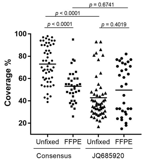 Scatter plots of the percentage coverage of the rabies virus genome of Ampliseq reads for all samples using either the consensus (Figure S1) or JQ685920 sequences for reference-guided assembly. Unfixed and FFPE samples are illustrated separately. Horizontal bars indicate the average value in each group and the calculated p-values between each group are shown above the diagram.